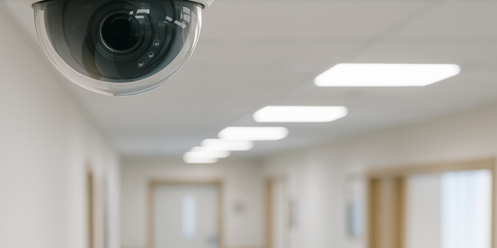 CFTV integrado à automação em hospital, mostrando uma câmera de segurança tipo dome instalada no teto, monitorando corredores e garantindo segurança e eficiência operacional.